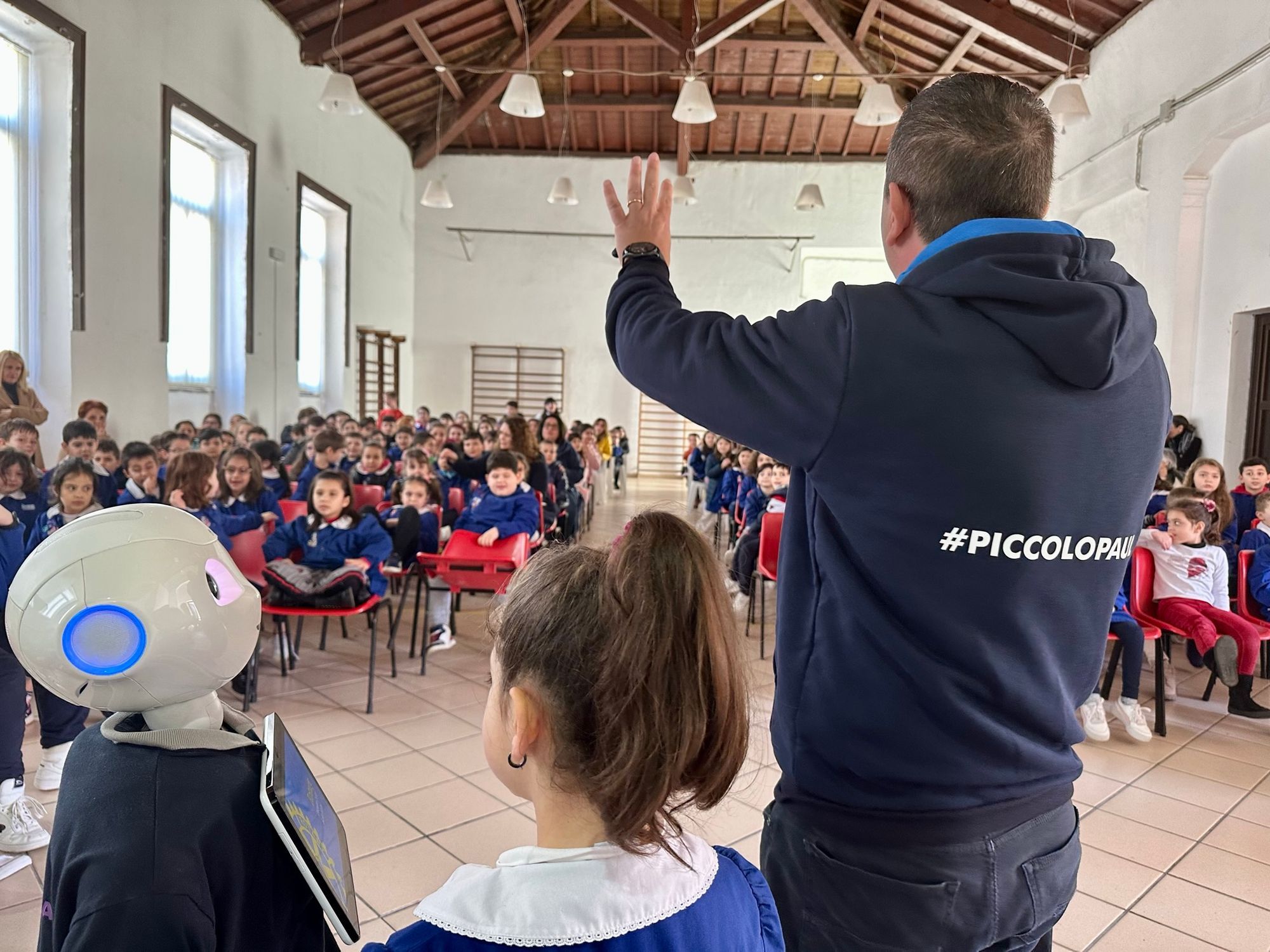 L'esperienza degli alunni: Gli studenti della scuola primaria hanno avuto l'opportunità di scoprire cosa sia l'intelligenza artificiale e di vedere in azione il robot Piccolo Paul, programmato da Salvino Fidacaro, Past President del Club e Responsabile per il Distretto 2110 del progetto. L'interazione diretta con l'umanoide ha suscitato grande curiosità ed entusiasmo tra i bambini, che hanno posto domande di vario genere, osservando con interesse l'elaborazione delle risposte del robot.